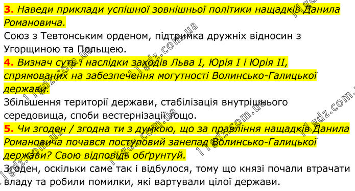 3. Наведи приклади успішної зовнішньої політики нащадків Данила Романовича. Союз з Тевтонським орденом, підтримка дружніх відносин з Угорщиною та Польщею. 4. Визнач суть і наслідки заходів Льва І, Юрія І і Юрія ІІ, спрямованих на забезпечення могутності Волинсько-Галицької держави. Збільшення території держави, стабілізація внутрішнього середовища, споби вестернізації тощо. 5. Чи згоден / згодна ти з думкою, що за правління нащадків Данила Романовича почався поступовий занепад Волинсько-Галицької держави? Свою відповідь обґрунтуй. Згоден, оскільки саме так і відбулося, тому що князі почали втрачати владу та робили помилки, які вартували цілої держави.