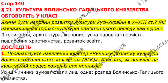 § 21. КУЛЬТУРА ВОЛИНСЬКО-ГАЛИЦЬКОГО КНЯЗІВСТВА ОБГОВОРІТЬ У КЛАСІ Якими були напрями розвитку культури Русі-України в Х–ХІІІ ст.? Які найважливіші історико-культурні пам’ятки цього періоду вам відомі? Літописання, архітектура, іконопис, усна народна творчість, поширення християнства, розвиток освіти. ДОСЛІДІТЬ 1. Проаналізуйте наведений кластер «Чинники розвитку культури Волинсько-Галицького князівства (ВГК)». Поясніть, як впливав на культурний процес кожен із цих чинників. Усі ці чинники зумовлювали лиш одне: розпад Волинсько-Галицього князівства.