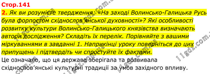 Як ви розумієте твердження: «На заході Волинсько-Галицька Русь була форпостом східнослов’янської духовності»? Які особливості розвитку культури Волинсько-Галицького князівства визначають автори дослідження? Складіть їх перелік. Порівняйте з вашими міркуваннями в завданні 1. Наприкінці уроку поверніться до цих припущень і підтвердіть чи спростуйте їх фактами. Це означало, що ця держава зберігала та розвивала східнослов’янські культурні традиції за умов західного впливу.