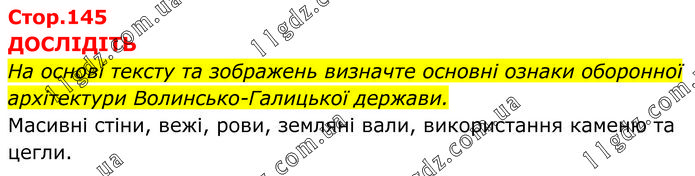 ДОСЛІДІТЬ На основі тексту та зображень визначте основні ознаки оборонної архітектури Волинсько-Галицької держави. Масивні стіни, вежі, рови, земляні вали, використання каменю та цегли.