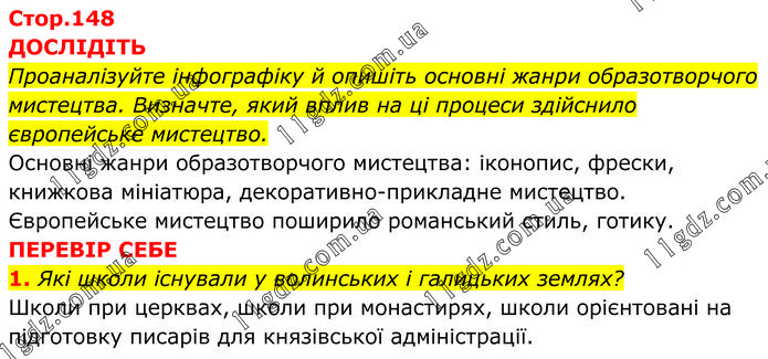 ДОСЛІДІТЬ Проаналізуйте інфографіку й опишіть основні жанри образотворчого мистецтва. Визначте, який вплив на ці процеси здійснило європейське мистецтво. Основні жанри образотворчого мистецтва: іконопис, фрески, книжкова мініатюра, декоративно-прикладне мистецтво. Європейське мистецтво поширило романський стиль, готику. ПЕРЕВІР СЕБЕ 1. Які школи існували у волинських і галицьких землях? Школи при церквах, школи при монастирях, школи орієнтовані на підготовку писарів для князівської адміністрації.