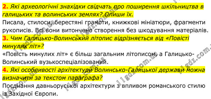 2. Які археологічні знахідки свідчать про поширення шкільництва в галицьких та волинських землях? Опиши їх. Писала, стилоси, берестяні грамоти, книжкові мініатюри, фрагменти рукописів. Всі вони витончено створення без шкодування матеріалів. 3. Чим Галицько-Волинський літопис відрізняється від «Повісті минулих літ»? «Повість минулих літ» є більш загальним літописом, а Галицько-Волинський вузькоспеціалізований. 4. Які особливості архітектури Волинсько-Галицької держави можна визначити за текстом параграфа? Поєднання давньоруської архітектури з впливом романського стилю із Західної Європи.