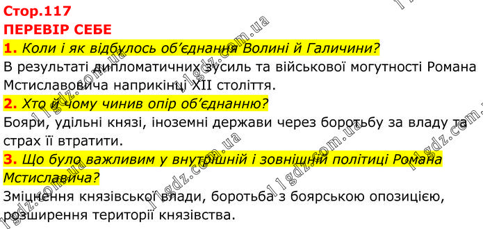 ПЕРЕВІР СЕБЕ 1. Коли і як відбулось об’єднання Волині й Галичини? В результаті дипломатичних зусиль та військової могутності Романа Мстиславовича наприкінці XII століття. 2. Хто й чому чинив опір об’єднанню? Бояри, удільні князі, іноземні держави через боротьбу за владу та страх її втратити. 3. Що було важливим у внутрішній і зовнішній політиці Романа Мстиславича? Зміцнення князівської влади, боротьба з боярською опозицією, розширення території князівства.