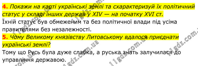 4. Покажи на карті українські землі та схарактеризуй їх політичний статус у складі інших держав у XIV — на початку XVI ст. Їхній статус був обмеженим та без політичної влади під усіма правителями без незалежності. 5. Чому Великому князівству Литовському вдалося приєднати українські землі? Тому що Русь була дуже слабка, а руська знать залучилася до управління державою.