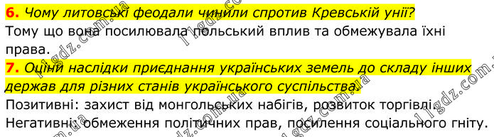 6. Чому литовські феодали чинили спротив Кревській унії? Тому що вона посилювала польський вплив та обмежувала їхні права. 7. Оціни наслідки приєднання українських земель до складу інших держав для різних станів українського суспільства. Позитивні: захист від монгольських набігів, розвиток торгівлі. Негативні: обмеження політичних прав, посилення соціального гніту.
