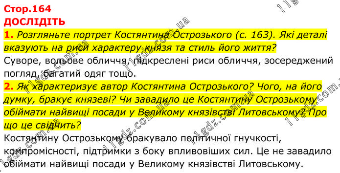 ДОСЛІДІТЬ 1. Розгляньте портрет Костянтина Острозького (с. 163). Які деталі вказують на риси характеру князя та стиль його життя? Суворе, вольове обличчя, підкреслені риси обличчя, зосереджений погляд, багатий одяг тощо. 2. Як характеризує автор Костянтина Острозького? Чого, на його думку, бракує князеві? Чи завадило це Костянтину Острозькому обіймати найвищі посади у Великому князівстві Литовському? Про що це свідчить? Костянтину Острозькому бракувало політичної гнучкості, компромісності, підтримки з боку впливовіших сил. Це не завадило обіймати найвищі посади у Великому князівстві Литовському.