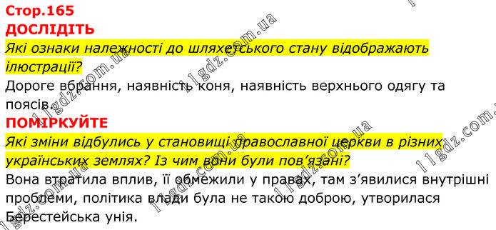 ДОСЛІДІТЬ Які ознаки належності до шляхетського стану відображають ілюстрації? Дороге вбрання, наявність коня, наявність верхнього одягу та поясів. ПОМІРКУЙТЕ Які зміни відбулись у становищі православної церкви в різних українських землях? Із чим вони були пов’язані? Вона втратила вплив, її обмежили у правах, там з’явилися внутрішні проблеми, політика влади була не такою доброю, утворилася Берестейська унія.