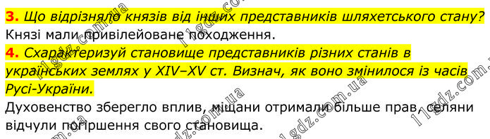 3. Що відрізняло князів від інших представників шляхетського стану? Князі мали привілейоване походження. 4. Схарактеризуй становище представників різних станів в українських землях у XIV–XV ст. Визнач, як воно змінилося із часів Русі-України. Духовенство зберегло вплив, міщани отримали більше прав, селяни відчули погіршення свого становища.