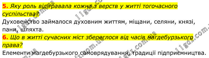 5. Яку роль відігравала кожна з верств у житті тогочасного суспільства? Духовенство займалося духовним життям, міщани, селяни, князі, пани, шляхта. 6. Що в житті сучасних міст збереглося від часів магдебурзького права? Елементи магдебурзького самоврядування, традиції підприємництва.