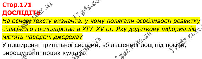 ДОСЛІДІТЬ На основі тексту визначте, у чому полягали особливості розвитку сільського господарства в ХІV–ХV ст. Яку додаткову інформацію містять наведені джерела? У поширенні трипільної системи, збільшенні площ під посіви, вирощуванні нових культур.