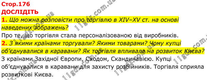 ДОСЛІДІТЬ 1. Що можна розповісти про торгівлю в XIV–XV ст. на основі наведених зображень? Про те, що торгівля стала персоналізованою від виробників. 2. З якими країнами торгували? Якими товарами? Чому купці об’єднувалися в каравани? Як торгівля впливала на розвиток Києва? З країнами Західної Європи, Сходом, Скандинавією. Купці об’єднувалися в каравани для захисту розбійників. Торгівля сприяла розвиткові Києва.