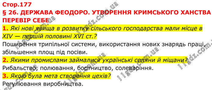 § 26. ДЕРЖАВА ФЕОДОРО. УТВОРЕННЯ КРИМСЬКОГО ХАНСТВА ПЕРЕВІР СЕБЕ 1. Які нові явища в розвитку сільського господарства мали місце в ХІV — першій половині ХVІ ст.? Поширення трипільної системи, використання нових знарядь праці, збільшення площ під посіви. 2. Якими промислами займалися українські селяни й міщани? Рибальство, полювання, бортництво, солеваріння. 3. Якою була мета створення цехів? Регулювання виробництва.