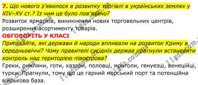 7. Що нового з’явилося в розвитку торгівлі в українських землях у ХІV–ХV ст.? Із чим це було пов’язано? Розвиток ярмарків, виникнення нових торговельних центрів, розширення асортименту товарів. ОБГОВОРІТЬ У КЛАСІ Пригадайте, які держави й народи впливали на розвиток Криму в середньовіччі? Чому правителі сусідніх держав прагнули встановити контроль над територією півострова? Греки, римляни, готи, хазари, половці, монголи, генуезці, венеційці, турки. Прагнули, тому що це гарний морський порт та потенційна військова база.