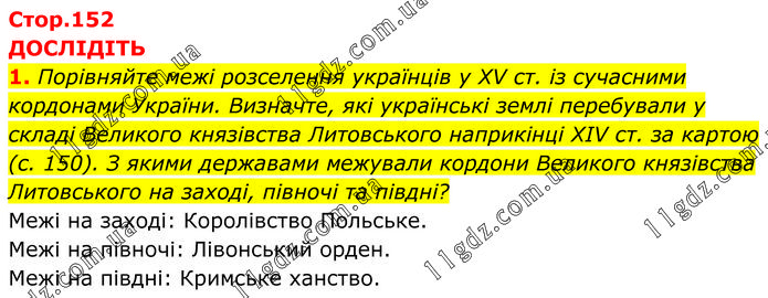 ДОСЛІДІТЬ 1. Порівняйте межі розселення українців у ХV ст. із сучасними кордонами України. Визначте, які українські землі перебували у складі Великого князівства Литовського наприкінці ХІV ст. за картою (с. 150). З якими державами межували кордони Великого князівства Литовського на заході, півночі та півдні? Межі на заході: Королівство Польське. Межі на півночі: Лівонський орден. Межі на півдні: Кримське ханство.
