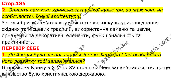 2. Опишіть пам’ятки кримськотатарської культури, зауважуючи на особливостях їхньої архітектури. Загальні риси пам’яток кримськотатарської культури: поєднання східних та місцевих традицій, використання каменю та цегли, орнаменти та декоративні елементи, функціональність та практичність. ПЕРЕВІР СЕБЕ 1. Де й коли було засноване князівство Феодоро? Які особливості його розвитку тобі запам’яталися? В гірському Криму з XIV по XV століття. Мені запам’яталося те, що це князівство було християнською державою.
