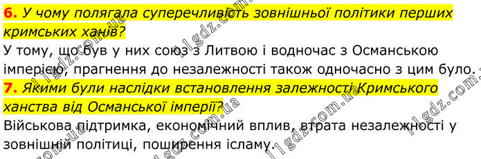 6. У чому полягала суперечливість зовнішньої політики перших кримських ханів? У тому, що був у них союз з Литвою і водночас з Османською імперією, прагнення до незалежності також одночасно з цим було. 7. Якими були наслідки встановлення залежності Кримського ханства від Османської імперії? Військова підтримка, економічний вплив, втрата незалежності у зовнішній політиці, поширення ісламу.