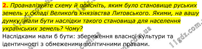2. Проаналізуйте схему й поясніть, яким було становище руських земель у складі Великого князівства Литовського. Якими, на вашу думку, мали бути наслідки такого становища для населення українських земель? Чому? Наслідками мали б бути: збереження власної культури та ідентичності з обмеженими політичними правами.