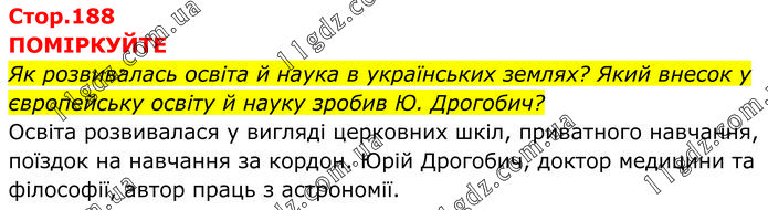 ПОМІРКУЙТЕ Як розвивалась освіта й наука в українських землях? Який внесок у європейську освіту й науку зробив Ю. Дрогобич? Освіта розвивалася у вигляді церковних шкіл, приватного навчання, поїздок на навчання за кордон. Юрій Дрогобич, доктор медицини та філософії, автор праць з астрономії.