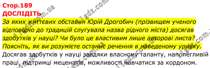 ДОСЛІДІТЬ За яких життєвих обставин Юрій Дрогобич (прізвищем ученого відповідно до традицій слугувала назва рідного міста) досягав здобутків у науці? Чи було це властивим лише авторові листа? Поясніть, як ви розумієте останнє речення в наведеному уривку. Досягав здобутків у науці завдяки власному таланту, наполегливій праці, підтримці меценатів, можливості навчатися за кордоном.