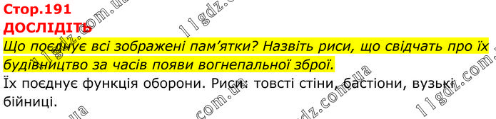 ДОСЛІДІТЬ Що поєднує всі зображені пам’ятки? Назвіть риси, що свідчать про їх будівництво за часів появи вогнепальної зброї. Їх поєднує функція оборони. Риси: товсті стіни, бастіони, вузькі бійниці.