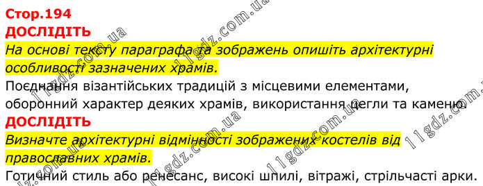 ДОСЛІДІТЬ На основі тексту параграфа та зображень опишіть архітектурні особливості зазначених храмів. Поєднання візантійських традицій з місцевими елементами, оборонний характер деяких храмів, використання цегли та каменю. ДОСЛІДІТЬ Визначте архітектурні відмінності зображених костелів від православних храмів. Готичний стиль або ренесанс, високі шпилі, вітражі, стрільчасті арки.