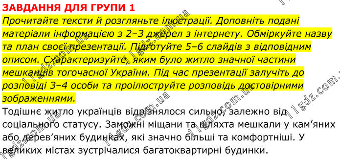 ЗАВДАННЯ ДЛЯ ГРУПИ 1 Прочитайте тексти й розгляньте ілюстрації. Доповніть подані матеріали інформацією з 2–3 джерел з інтернету. Обміркуйте назву та план своєї презентації. Підготуйте 5–6 слайдів з відповідним описом. Схарактеризуйте, яким було житло значної частини мешканців тогочасної України. Під час презентації залучіть до розповіді 3–4 особи та проілюструйте розповідь достовірними зображеннями. Тодішнє житло українців відрізнялося сильно, залежно від соціального статусу. Заможні міщани та шляхта мешкали у кам’яних або дерев’яних будинках, які значно більші та комфортніші. У великих містах зустрічалися багатоквартирні будинки.