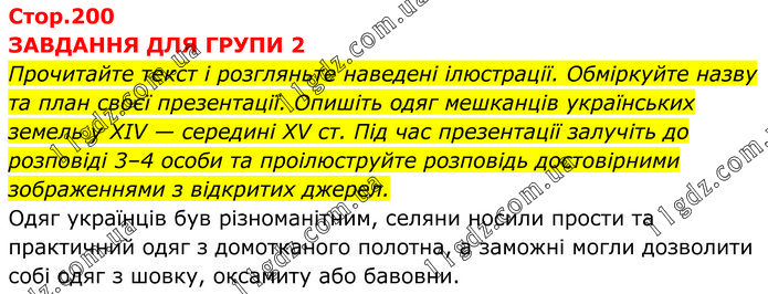 ЗАВДАННЯ ДЛЯ ГРУПИ 2 Прочитайте текст і розгляньте наведені ілюстрації. Обміркуйте назву та план своєї презентації. Опишіть одяг мешканців українських земель у XIV — середині XV ст. Під час презентації залучіть до розповіді 3–4 особи та проілюструйте розповідь достовірними зображеннями з відкритих джерел. Одяг українців був різноманітним, селяни носили прости та практичний одяг з домотканого полотна, а заможні могли дозволити собі одяг з шовку, оксамиту або бавовни.