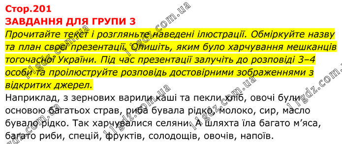 ЗАВДАННЯ ДЛЯ ГРУПИ 3 Прочитайте текст і розгляньте наведені ілюстрації. Обміркуйте назву та план своєї презентації. Опишіть, яким було харчування мешканців тогочасної України. Під час презентації залучіть до розповіді 3–4 особи та проілюструйте розповідь достовірними зображеннями з відкритих джерел. Наприклад, з зернових варили каші та пекли хліб, овочі були основою багатьох страв, риба бувала рідко, молоко, сир, масло бувало рідко. Так харчувалися селяни. А шляхта їла багато м’яса, багато риби, спецій, фруктів, солодощів, овочів, напоїв.