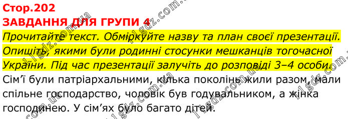 ЗАВДАННЯ ДЛЯ ГРУПИ 4 Прочитайте текст. Обміркуйте назву та план своєї презентації. Опишіть, якими були родинні стосунки мешканців тогочасної України. Під час презентації залучіть до розповіді 3–4 особи. Сім’ї були патріархальними, кілька поколінь жили разом, мали спільне господарство, чоловік був годувальником, а жінка господинею. У сім’ях було багато дітей.