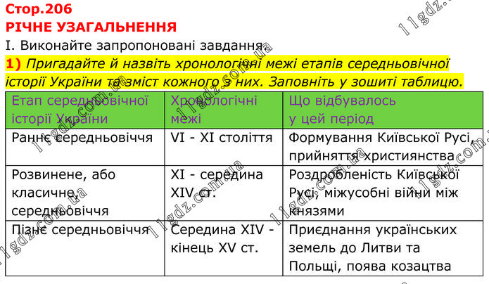 I. Виконайте запропоновані завдання. 1) Пригадайте й назвіть хронологічні межі етапів середньовічної історії України та зміст кожного з них. Заповніть у зошиті таблицю.