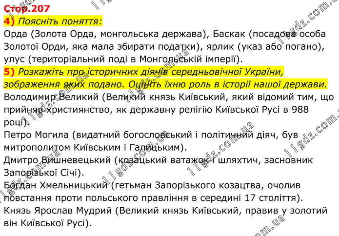 4) Поясніть поняття: Орда (Золота Орда, монгольська держава), Баскак (посадова особа Золотої Орди, яка мала збирати податки), ярлик (указ або погано), улус (територіальний поді в Монгольській імперії). 5) Розкажіть про історичних діячів середньовічної України, зображення яких подано. Оцініть їхню роль в історії нашої держави. Володимир Великий (Великий князь Київський, який відомий тим, що прийняв християнство, як державну релігію Київської Русі в 988 році). Петро Могила (видатний богословський і політичний діяч, був митрополитом Київським і Галицьким). Дмитро Вишневецький (козацький ватажок і шляхтич, засновник Запорізької Січі). Богдан Хмельницький (гетьман Запорізького козацтва, очолив повстання проти польського правління в середині 17 століття). Князь Ярослав Мудрий (Великий князь Київський, правив у золотий він Київської Русі).