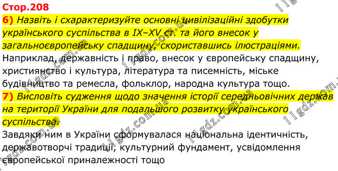 6) Назвіть і схарактеризуйте основні цивілізаційні здобутки українського суспільства в ІХ–ХV ст. та його внесок у загальноєвропейську спадщину, скориставшись ілюстраціями. Наприклад, державність і право, внесок у європейську спадщину, християнство і культура, література та писемність, міське будівництво та ремесла, фольклор, народна культура тощо. 7) Висловіть судження щодо значення історії середньовічних держав на території України для подальшого розвитку українського суспільства. Завдяки ним в України сформувалася національна ідентичність, державотворчі традиції, культурний фундамент, усвідомлення європейської приналежності тощо