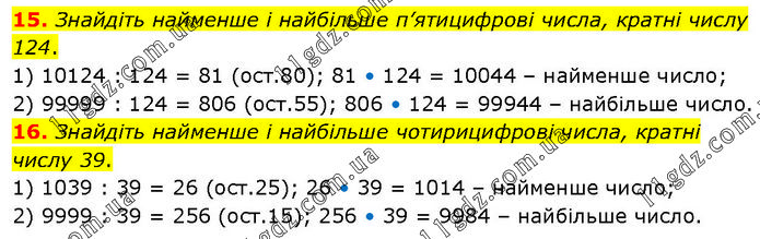 15. Знайдіть найменше і найбільше п’ятицифрові числа, кратні числу 124. 1) 10124 : 124 = 81 (ост.80); 81 • 124 = 10044 – найменше число; 2) 99999 : 124 = 806 (ост.55); 806 • 124 = 99944 – найбільше число. 16. Знайдіть найменше і найбільше чотирицифрові числа, кратні числу 39. 1) 1039 : 39 = 26 (ост.25); 26 • 39 = 1014 – найменше число; 2) 9999 : 39 = 256 (ост.15); 256 • 39 = 9984 – найбільше число.