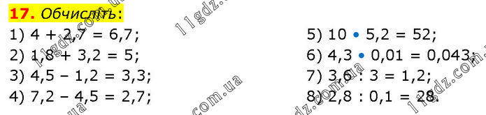 Обчисліть: 1) 4 + 2,7 = 6,7; 2) 1,8 + 3,2 = 5; 3) 4,5 – 1,2 = 3,3; 4) 7,2 – 4,5 = 2,7; 5) 10 • 5,2 = 52; 6) 4,3 • 0,01 = 0,043; 7) 3,6 : 3 = 1,2; 8) 2,8 : 0,1 = 28.