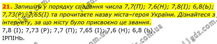 Запишіть у порядку спадання числа 7,7(П); 7,6(H); 7,8(І); 6,8(Ь); 7,73(Р); 7,65(І) та прочитаєте назву міста–героя України. Дізнайтеся з інтернету, за що місту було присвоєно це звання. 7,8 (І); 7,73 (Р); 7,7 (П); 7,65 (І); 7,6 (Н); 6,8 (Ь). ІРПІНЬ.