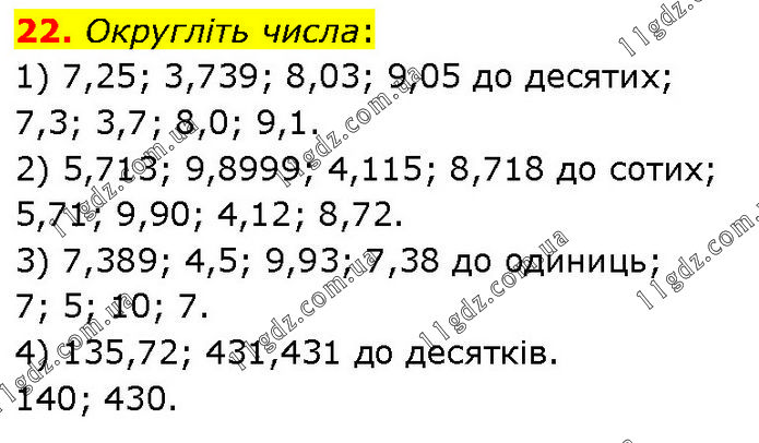 Округліть числа: 1) 7,25; 3,739; 8,03; 9,05 до десятих; 7,3; 3,7; 8,0; 9,1. 2) 5,713; 9,8999; 4,115; 8,718 до сотих; 5,71; 9,90; 4,12; 8,72. 3) 7,389; 4,5; 9,93; 7,38 до одиниць; 7; 5; 10; 7. 4) 135,72; 431,431 до десятків. 140; 430.