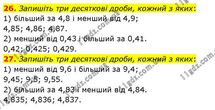 26. Запишіть три десяткові дроби, кожний з яких: 1) більший за 4,8 і менший від 4,9; 4,85; 4,86; 4,87. 2) менший від 0,43 і більший за 0,41. 0,42; 0,425; 0,429. 27. Запишіть три десяткові дроби, кожний з яких: 1) менший від 9,6 і більший за 9,4; 9,45; 9,5; 9,55. 2) більший за 4,83 і менший від 4,84. 4,835; 4,836; 4,837.