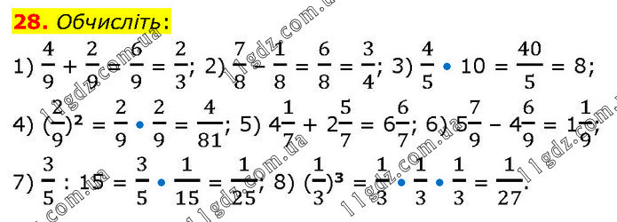 Обчисліть: 1) 4/9 + 2/9 = 6/9 = 2/3; 2) 7/8 – 1/8 = 6/8 = 3/4; 3) 4/5 • 10 = 40/5 = 8; 4) (2/9)2 = 2/9 • 2/9 = 4/81; 5) 41/7 + 25/7 = 66/7; 6) 57/9 – 46/9 = 11/9; 7) 3/5 : 15 = 3/5 • 1/15 = 1/25; 8) (1/3)3 = 1/3 • 1/3 • 1/3 = 1/27.