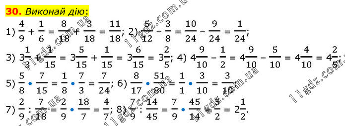 Виконай дію: 1) 4/9 + 1/6 = 8/18 + 3/18 = 11/18; 2) 5/12 – 3/8 = 10/24 – 9/24 = 1/24; 3) 31/3 + 1/15 = 35/15 + 1/15 = 36/15 = 32/5; 4) 49/10 – 1/2 = 49/10 – 5/10 = 44/10 = 42/5; 5) 5/8 • 7/15 = 1/8 • 7/3 = 7/24; 6) 8/17 • 51/80 = 1/1 • 3/10 = 3/10; 7) 2/9 : 7/18 = 2/9 • 18/7 = 4/7; 8) 7/9 : 14/45 = 7/9 • 45/14 = 5/2 = 21/2.