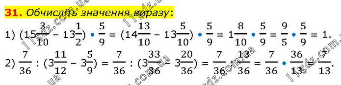 Обчисліть значення виразу: 1) (153/10 – 131/2) • 5/9 = (1413/10 – 135/10) • 5/9 = 18/10 • 5/9 = 9/5 • 5/9 = 1. 2) 7/36 : (311/12 – 35/9) = 7/36 : (333/36 – 320/36) = 7/36 : 13/36 = 7/36 • 36/13 = 7/13.