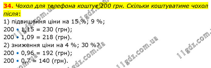 Чохол для телефона коштує 200 грн. Скільки коштуватиме чохол після: 1) підвищення ціни на 15 %; 9 %; 200 • 1,15 = 230 (грн); 200 • 1,09 = 218 (грн). 2) зниження ціни на 4 %; 30 %? 200 • 0,96 = 192 (грн); 200 • 0,7 = 140 (грн).