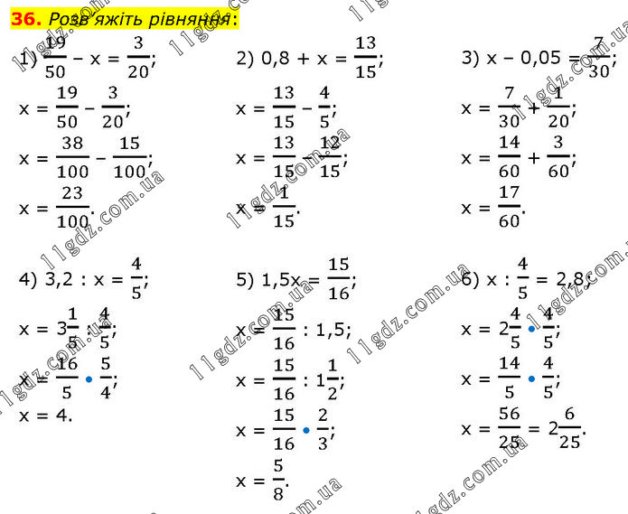 Розв’яжіть рівняння: 1) 19/50 – х = 3/20; х = 19/50 – 3/20; х = 38/100 – 15/100; х = 23/100. 2) 0,8 + х = 13/15; х = 13/15 – 4/5; х = 13/15 – 12/15; х = 1/15. 3) х – 0,05 = 7/30; х = 7/30 + 1/20; х = 14/60 + 3/60; х = 17/60. 4) 3,2 : х = 4/5; х = 31/5 : 4/5; х = 16/5 • 5/4; х = 4. 5) 1,5х = 15/16; х = 15/16 : 1,5; х = 15/16 : 11/2; х = 15/16 • 2/3; х = 5/8. 6) х : 4/5 = 2,8; х = 24/5 • 4/5; х = 14/5 • 4/5; х = 56/25 = 26/25.