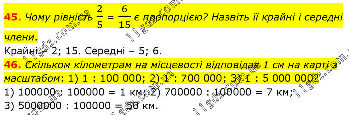 45. Чому рівність 2/5 = 6/15 є пропорцією? Назвіть її крайні і середні члени. Крайні – 2; 15. Середні – 5; 6. 46. Скільком кілометрам на місцевості відповідає 1 см на карті з масштабом: 1) 1 : 100 000; 2) 1 : 700 000; 3) 1 : 5 000 000? 1) 100000 : 100000 = 1 км; 2) 700000 : 100000 = 7 км; 3) 5000000 : 100000 = 50 км.