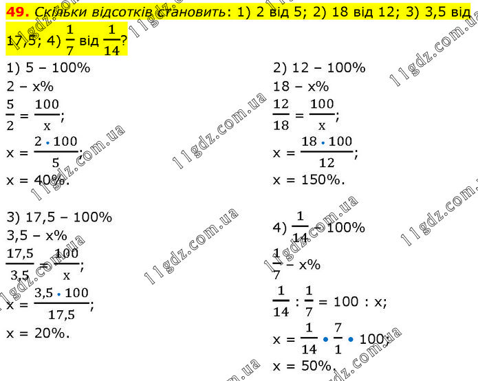 Скільки відсотків становить: 1) 2 від 5; 2) 18 від 12; 3) 3,5 від 17,5; 4) 1/7 від 1/14? 1) 5 – 100% 2 – х% 5/2 = 100/х; х = (2 • 100)/5; х = 40%. 2) 12 – 100% 18 – х% 12/18 = 100/х; х = (18 • 100)/12; х = 150%. 3) 17,5 – 100% 3,5 – х% 17,5/3,5 = 100/х; х = (3,5 • 100)/17,5; х = 20%. 4) 1/14 – 100% 1/7 – х% 1/14 : 1/7 = 100 : х; х = 1/14 • 7/1 • 100; х = 50%.