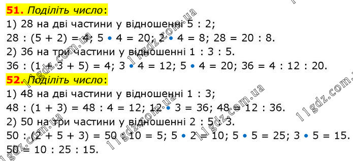 51. Поділіть число: 1) 28 на дві частини у відношенні 5 : 2; 28 : (5 + 2) = 4; 5 • 4 = 20; 2 • 4 = 8; 28 = 20 : 8. 2) 36 на три частини у відношенні 1 : 3 : 5. 36 : (1 + 3 + 5) = 4; 3 • 4 = 12; 5 • 4 = 20; 36 = 4 : 12 : 20. 52. Поділіть число: 1) 48 на дві частини у відношенні 1 : 3; 48 : (1 + 3) = 48 : 4 = 12; 12 • 3 = 36; 48 = 12 : 36. 2) 50 на три частини у відношенні 2 : 5 : 3. 50 : (2 + 5 + 3) = 50 : 10 = 5; 5 • 2 = 10; 5 • 5 = 25; 3 • 5 = 15. 50 = 10 : 25 : 15.
