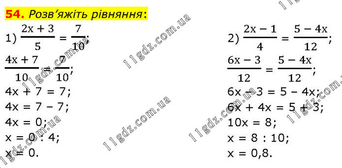 Розв’яжіть рівняння: 1) (2х + 3)/5 = 7/10; (4х + 7)/10 = 7/10; 4х + 7 = 7; 4х = 7 – 7; 4х = 0; х = 0 : 4; х = 0. 2) (2х - 1)/4 = (5 - 4х)/12; (6х - 3)/12 = (5 - 4х)/12; 6х – 3 = 5 – 4х; 6х + 4х = 5 + 3; 10х = 8; х = 8 : 10; х = 0,8.