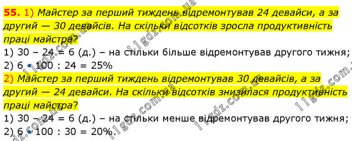 55. 1) Майстер за перший тиждень відремонтував 24 девайси, а за другий — 30 девайсів. На скільки відсотків зросла продуктивність праці майстра? 1) 30 – 24 = 6 (д.) – на стільки більше відремонтував другого тижня; 2) 6 • 100 : 24 = 25% 2) Майстер за перший тиждень відремонтував 30 девайсів, а за другий — 24 девайси. На скільки відсотків знизилася продуктивність праці майстра? 1) 30 – 24 = 6 (д.) – на стільки менше відремонтував другого тижня; 2) 6 • 100 : 30 = 20%.