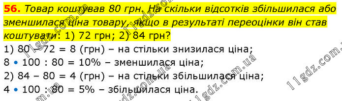 Товар коштував 80 грн. На скільки відсотків збільшилася або зменшилася ціна товару, якщо в результаті переоцінки він став коштувати: 1) 72 грн; 2) 84 грн? 1) 80 – 72 = 8 (грн) – на стільки знизилася ціна; 8 • 100 : 80 = 10% – зменшилася ціна; 2) 84 – 80 = 4 (грн) – на стільки збільшилася ціна; 4 • 100 : 80 = 5% – збільшилася ціна.