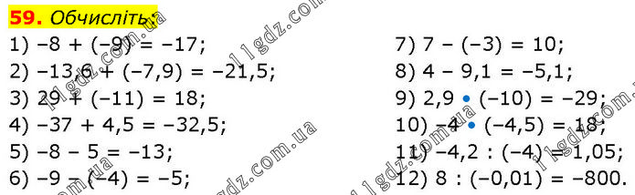 Обчисліть: 1) –8 + (–9) = –17; 2) –13,6 + (–7,9) = –21,5; 3) 29 + (–11) = 18; 4) –37 + 4,5 = –32,5; 5) –8 – 5 = –13; 6) –9 – (–4) = –5; 7) 7 – (–3) = 10; 8) 4 – 9,1 = –5,1; 9) 2,9 • (–10) = –29; 10) –4 • (–4,5) = 18; 11) –4,2 : (–4) = 1,05; 12) 8 : (–0,01) = –800.