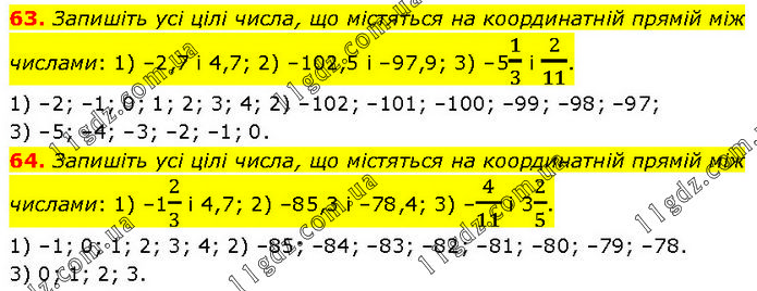 63. Запишіть усі цілі числа, що містяться на координатній прямій між числами: 1) –2,7 і 4,7; 2) –102,5 і –97,9; 3) –51/3 і 2/11. 1) –2; –1; 0; 1; 2; 3; 4; 2) –102; –101; –100; –99; –98; –97; 3) –5; –4; –3; –2; –1; 0. 64. Запишіть усі цілі числа, що містяться на координатній прямій між числами: 1) –12/3 і 4,7; 2) –85,3 і –78,4; 3) –4/11 і 32/5. 1) –1; 0; 1; 2; 3; 4; 2) –85; –84; –83; –82; –81; –80; –79; –78. 3) 0; 1; 2; 3.